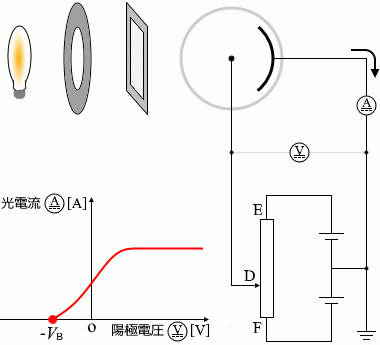 しぼりを固定し、フィルターも1種類に定めた上で、接点Dを動かすと電圧計と電流計の値は左のグラフのように変化します。電圧が 0 であっても電流は流れます。接点DをFに近づけていくと(陽極の電位を低くしていくと)ある時点で電流は流れなくなります