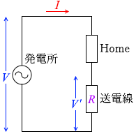「 発電所から送電線に送り出される交流の電圧を V 、電流を I とすると、その電力は IV と表される。送電線の抵抗値が R であるとき、送電線で消費される電力は、 I2R となる(または\(\large{\frac{\ \color{#00f}{V'^2}}{\color{#c0c}{R}}}\) となる。\(\large{\frac{\ \color{#00f}{V^2}}{\color{#c0c}{R}}}\)ではない)。したがって、同じ電力量を送るとき、送電線での電力損失を小さくするには、発電所で変圧器を使い、電圧を 高く して送電すればよい。(なぜなら電力量が同じということは電力が同じということであり、電力は IV であり、これが同じということは V を高くすれば I が小さくなり、送電線での損失 I2R が小さくなるから。) 」