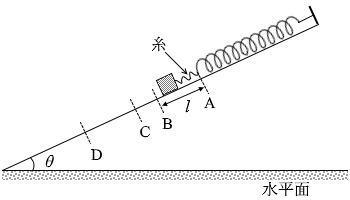 水平面と角度 θ をなすなめらかな斜面上に、ばね定数 k のばねの上端を固定し、その下端に質量 m の物体を長さ l の糸でつないだ。ばねが自然の長さのときのばねの下端の位置を点Aとする。はじめ、物体を手で支えて、点Aに静止させておいた。ただし、物体の位置は、糸のついた面の位置で示すこととする。